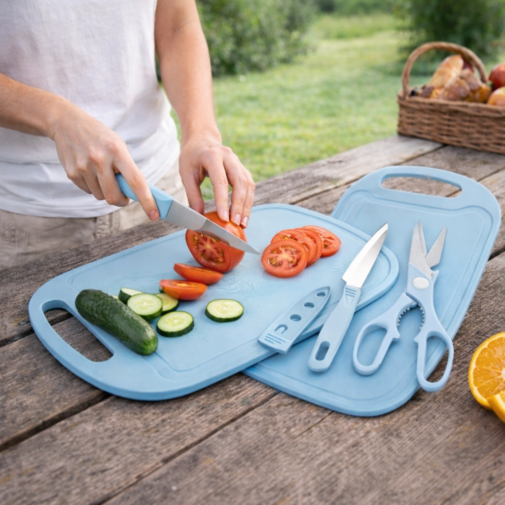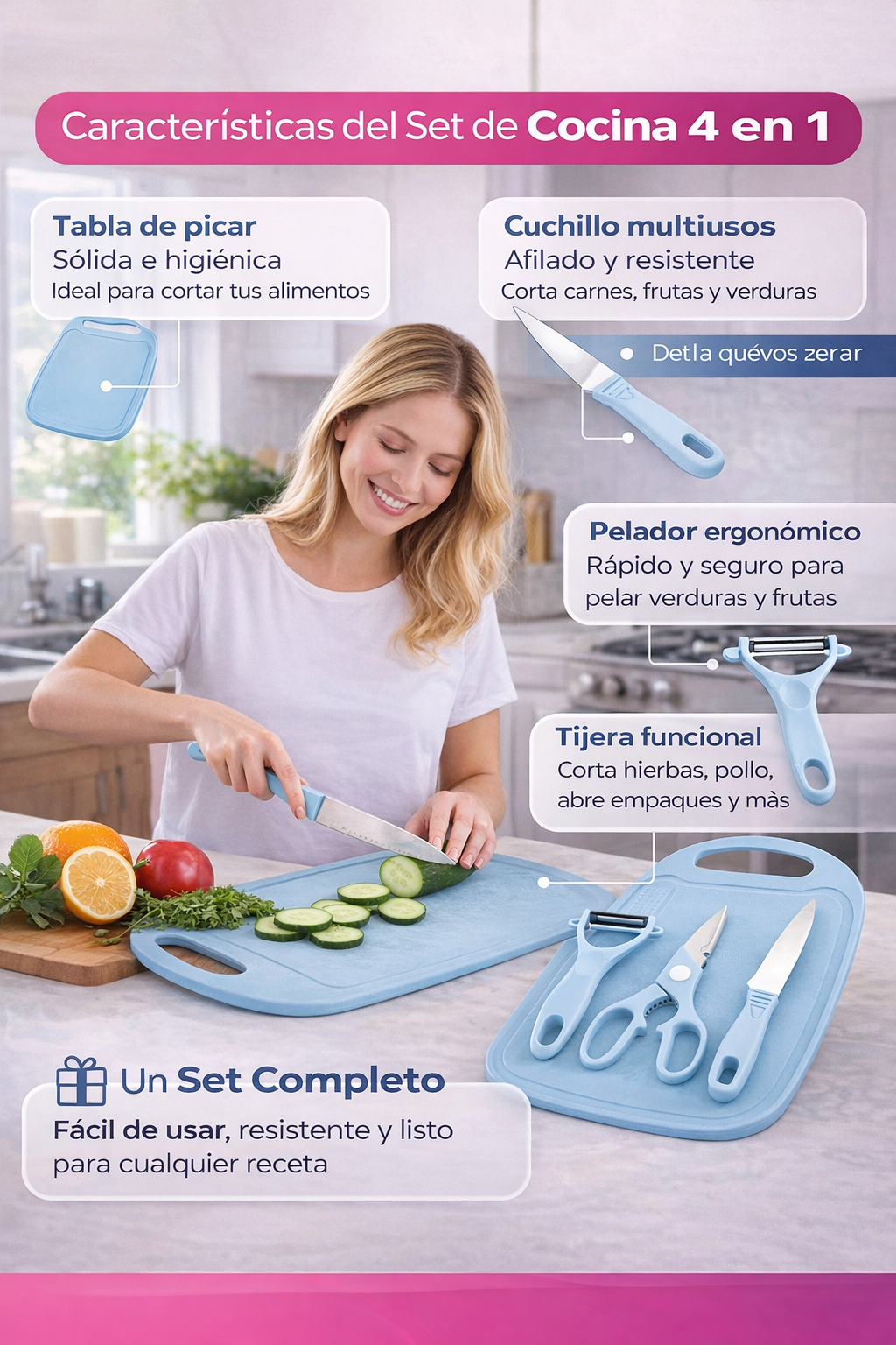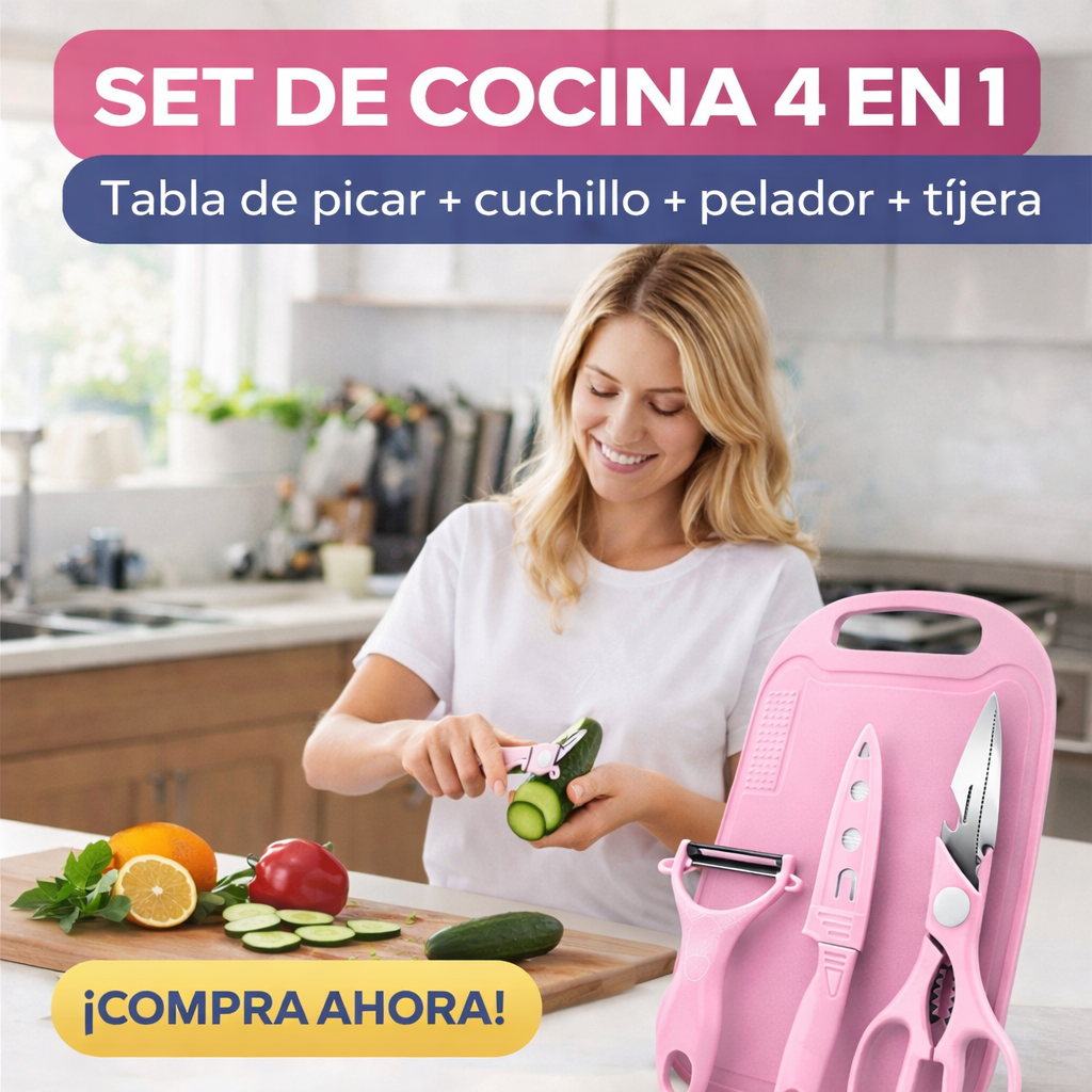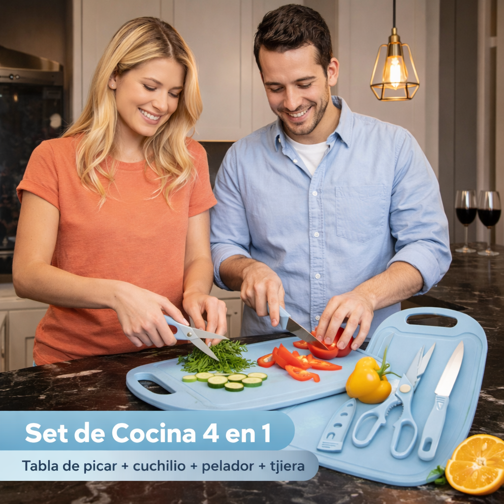 🔪 Set 4 en 1: incluye tabla de picar, cuchillo, pelador y tijera en un solo kit.